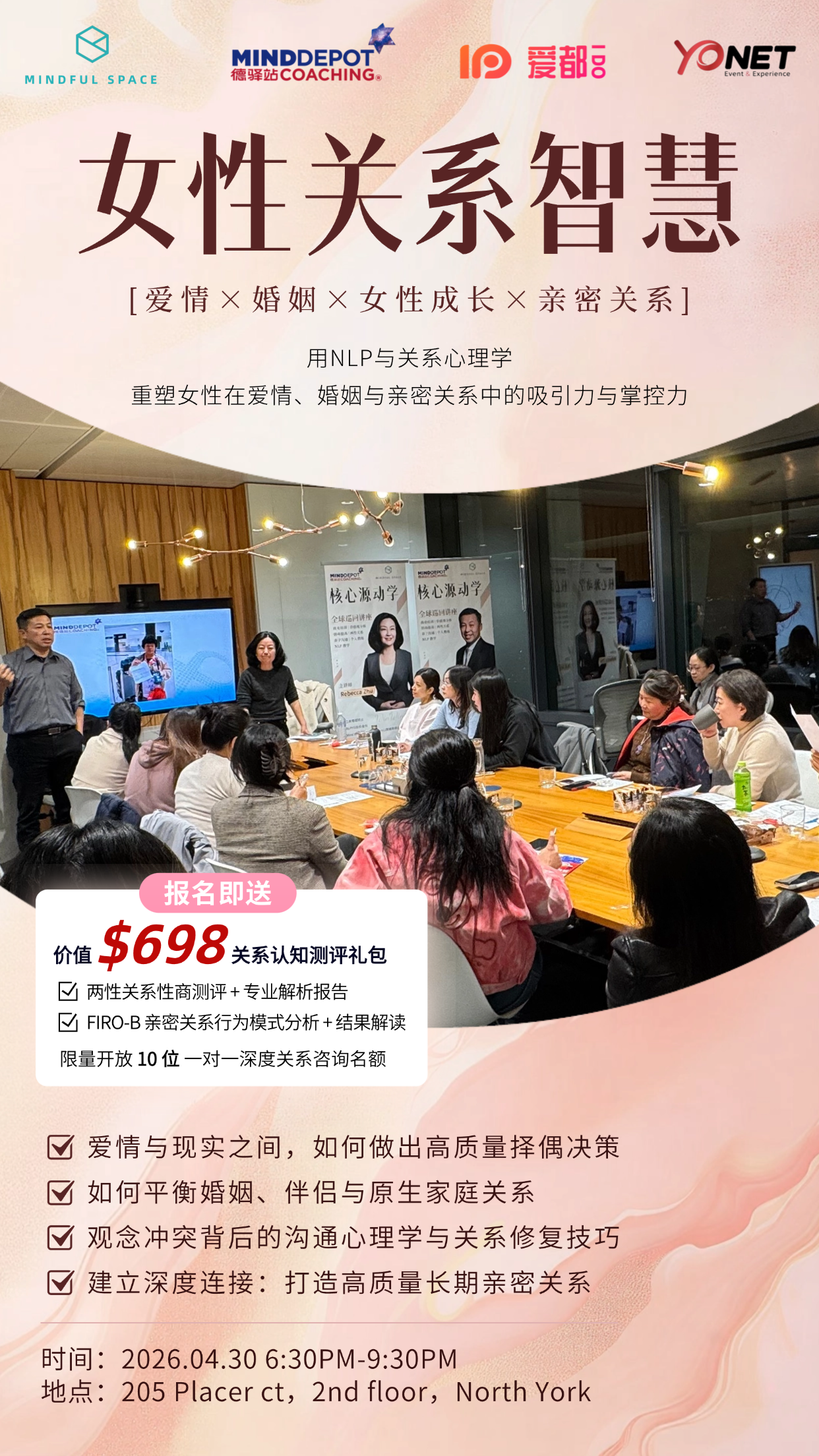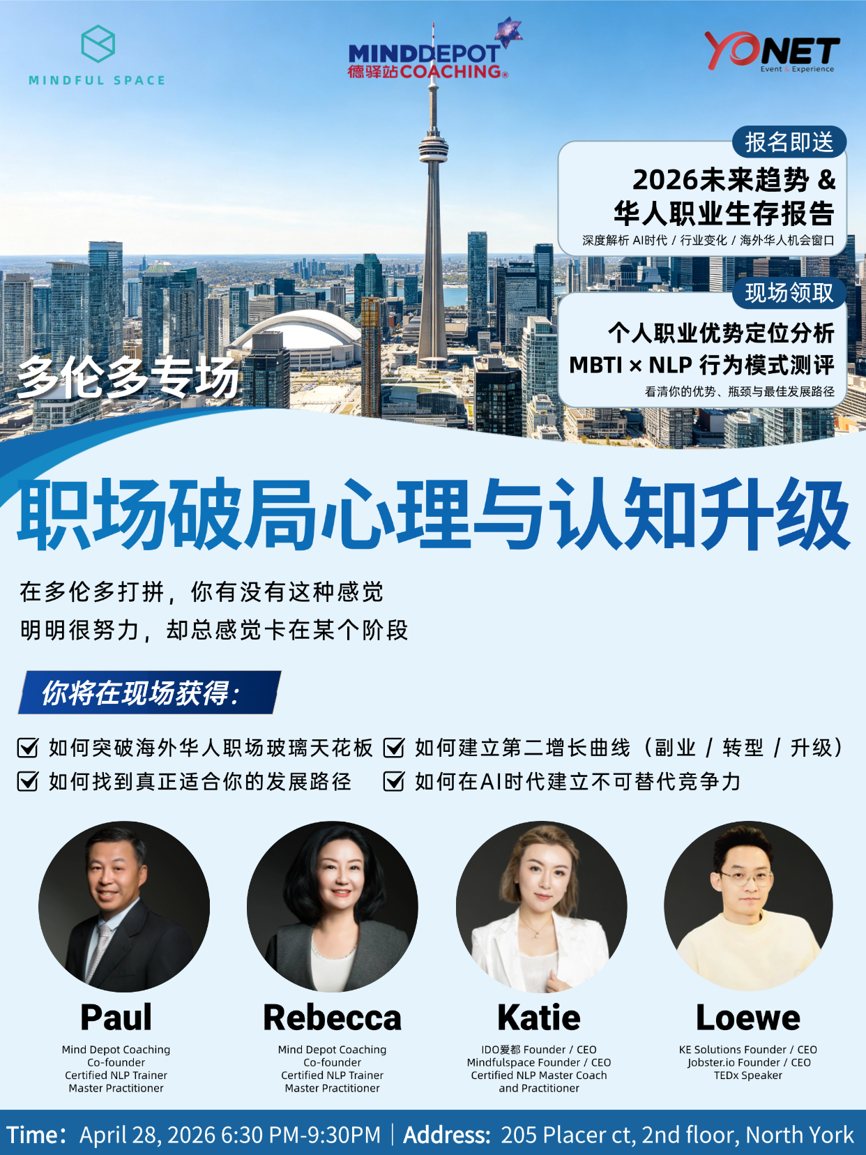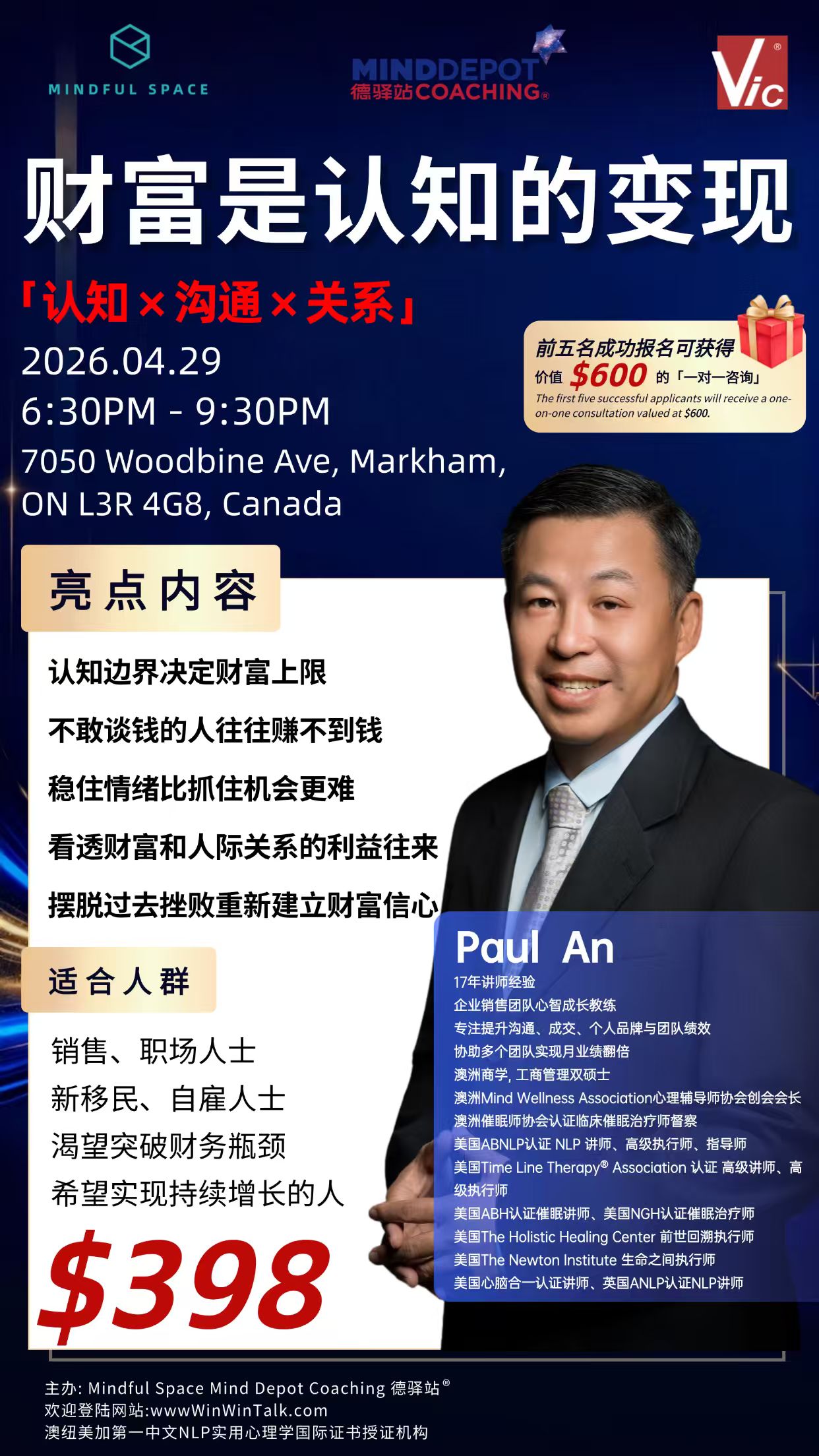2026全球核心源动学 加拿大站 Global Core Dynamics Seminar' Canada Edition in 2026 15 Mar - 3 May 2026, Canada GET YOUR LECTURE PASS 2026 Attending Organisations 讲座介绍 全球巡讲 了解详情 出席嘉宾 了解详情 讲座安排 实用心理学讲座 了解详情 往期讲座 精彩内容回顾 了解详情 MINDFUL SPACE 激情与梦想的摇篮,成长与成功的引领者 在一个激情与梦想交织的年代,Mindful Space应运而生,承载着对未来的无限憧憬与探索精神。这是一个由Katie Sun创立的平台,一个汇聚创新思维与奋斗精神的温暖家园。在这里,每一位团队成员都带着青春的热血与活力,为共同的理想而奋斗。我们彼此激励,携手成长,在探索未知的路上勇往直前。 作为一个致力于发现和培养个人成长的全球性品牌,Mindful Space始终秉承以人为本的理念,帮助个人在心灵、事业与家庭中找到平衡与突破。无论是跨越文化的边界,还是面对人生的挑战,我们的使命是成为每一位海外华人追求卓越的引路人。2025年,Mindful Space将携手Mind Depot,在全球范围内为海外华人举办核心动力学讲座。这些讲座旨在激发个人潜力,引领全球新一代华人不仅在事业中蓬勃发展,更在家庭中收获幸福与和谐,开启事业与生活双丰收的全新篇章。在Mindful Space,我们不止于梦想,更将梦想化为现实。因为我们相信,每个人都拥有改变命运的力量,而我们,正是那点燃希望与成长之光的火炬。加入Mindful Space,共同探索更广阔的世界,迈向成功的未来 MIND DEPOT 正式成立于2008年,是一家总部设在悉尼的专业心理培训辅导机构。主要向澳洲、 美国、 新西兰、 新加坡、加拿大的华人提供NLP (Neuro-Linguistic Programming 身心语言程序学), TLT (Time Line Therapy®时间线疗法), 教练技术等优质课程及研讨会。 同时提供销售, 管理, 性格, 价值观, 情商, 优势职涯规划, 亲子沟通, 两性关系, 自我成长等服务。Mind Depot Coaching的服务形式包括: 各类主题讲座, 小班制课程, 一对一个案服务以及企业单位内部培训等。 无论何种形式的交流方式, 我们都秉着个性差异化的原则, 用适合您的方式, 达成您所想。多年来, Mind Depot Coaching 已经为成上万的华人提供课程与咨询服务, 并为数百家企业提供了商业培训, 深受澳洲, 新西兰,美国华人的推崇与好评。 讲师也时常接受媒体及华人社团的邀请, 参加各类服务于华人的活动, 经口耳相传, 已建立起良好的口碑。 核心源动学 核心源动学是我们根据多年教学和咨询的经验总结出来的一套方法,从多维角度,找出个人缺乏动力或造成困扰的核心,并且为您认知、调整、突破现有的或即将面临的挑战,把自己最好的一面自然地呈现出来。所以整个核心源动学是依照下面四个步骤: 曾接受过 NLP 系统训练的国际名人 美国前总统 奥巴马美国前总统 比尔·克林顿英国前王妃 戴安娜篮球巨星 麦克尔·乔丹世界网球冠军 阿加西世界第一潜能开发大师 安东尼·罗宾斯等等…… “冠军永远是属于那些不断进步并且保持巅峰状态的人,NLP是各行各业巅峰战士的终极教练。 ” NBA 纽约尼克队教练赖利 “NLP 的温馨与热情将鼓舞学习者真正掌握自己的生活。 ” 《一分钟经理人》作者肯尼斯·布 兰查 “哈佛商学院的学生更应了解潜能激发,NLP 。” 哈佛商学院院长麦克亚瑟 “NLP 不仅教会了我们销售,更教会了我们如何去思考与管理。 ” 微软总裁 比尔·盖茨 “在销售这个领域中,我还没有见过 NLP那么丰富的思想。 ” 通用电气前 CEO 杰克韦尔奇 “这是人生必备的生活指南。 ” 著名影星阿诺. 史瓦辛格 “NLP 是世界上最神奇的人生导师。 ” 网球明星阿加西 “用心成就无限” 核心理念是“用心成就无限”。以西方先进科学的工具结合中国优秀的传统文化, 协助广大学员与客户突破原有的思维模式, 重新定位, 取得事业、家庭、健康的成功。通过我们“用心”对待每一位客户, 影响大家也“用心”经营自己的生活。我们相信, 任何人只要“用心”, 都可以心想事成!因为我们的“用心”, 让更多的华人在异国他乡用自己的语言, 以相似的背景, 更有效地交流, 从心灵深处得到真正有效的帮助, 迈向自信的未来。再一次, 我们相信, 只要“用心”, 肯定可以与我们每一位客户共创“多赢”的局面。 透过核心源动学...... 你会发现良好的沟通比你想象的要容易得多。几个简单的步骤、精妙的技巧,就能让你清清楚楚表达自己,对方明明白白你的意思。真正的沟通、销售都是由内而外的,籍由性格与价值观你可以深层次地了解自己,感染对方,可以帮助你在家庭事业财富上起到事半功倍的效果,并产生源源不断的动力达成你想要的结果。 2026 CANADA SUMMIT 商业培训 | 价值观分析 | 情商提高 | 两性关系 亲子沟通 | 个人教练 | NLP 教学 出席嘉宾 专业人士现场分享 Katie Sun 美国波士顿大学MBAMind Depot Coaching德驿站 首席战略官美国 ABNLP 认证 NLP 高级执行师、指导师美国 Time Line Therapy Association 认证高级执行师NLP高级指导师和执行师 Certified NLP Master Coach and Practitioner时间线疗法高级执行师 Certified Timeline Therapy @ Master Practitioner催眠师(高级) Certified Hypnotherapy (Advanced)澳洲 Mind Wellness Association 心理辅导师协会会员专注于推动 NLP全球化与落地的战略桥梁 Rebecca Zhu 澳洲工商管理硕士Mind Depot Coaching德驿站 联合创始人澳洲 NLPHS 协会会长澳洲 Mind Wellness Association 心理辅导师协会检察长澳洲政